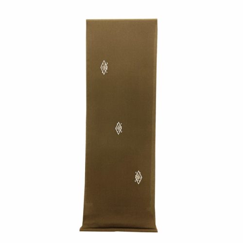 炭手前(初炭や後炭)や濃茶席など、正式なお茶会にふさわ後炭一本で、付け下げや色無地はもちろん、正絹小紋[紋意匠に飛び柄松文・プラチナ箔使用]のグレー地と合わせても品格が際立ちます。お茶席の落ち着いた空気の中で、控えめな美を感じさせる帯です。。