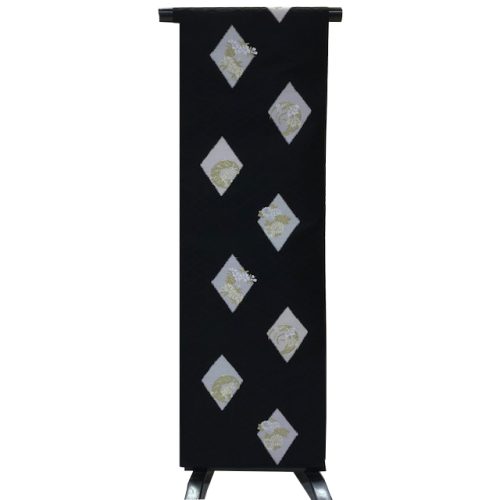 西陣織九寸名古屋帯 佐々木染織謹製「黒地に菱の中にウサギや菊」