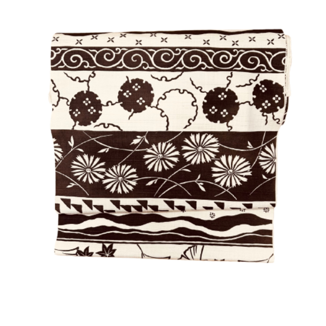 ひとつの帯の中に多彩な文様が調和し、季節を問わず一年を通して締められる意匠となっています。