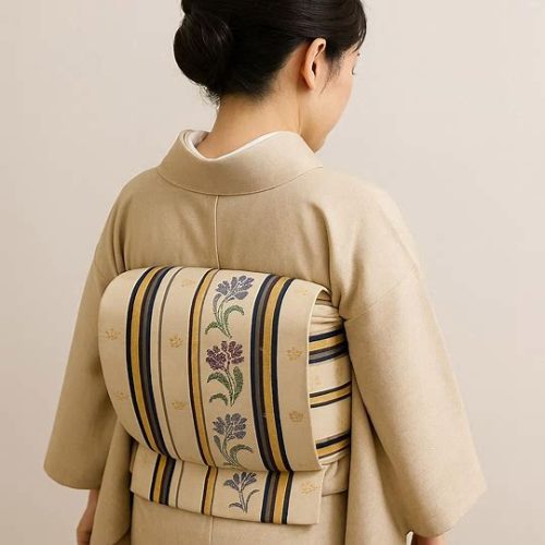 あくまでイメージとしてご覧くださいませ。帯屋捨松 謹製|九寸名古屋帯|西陣織|ベージュ×忍冬唐草・間道文様|お茶席・観劇・趣味の会・付け下げ・小紋に最適