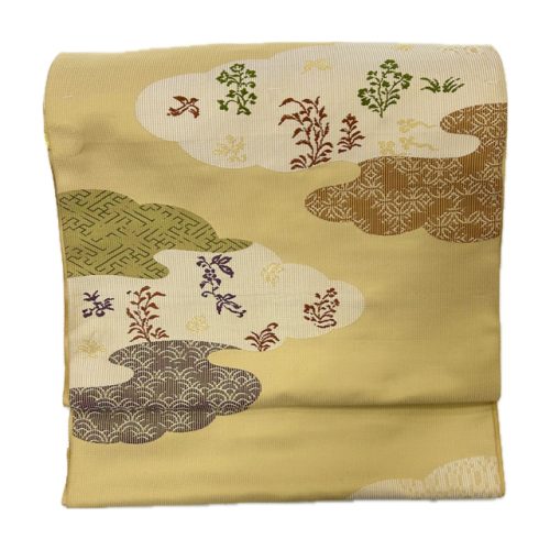 かった黄色のくらい黒茶色に近いお色ではないでしょうか。帯は 西陣織九寸名古屋帯【山田織物謹製】「雲どりに七宝や青海波・六通」