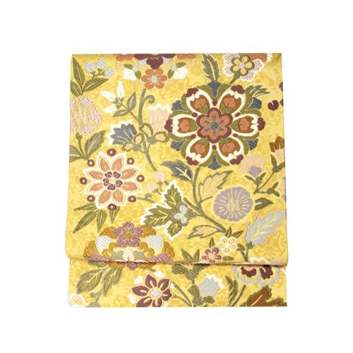 優美な金茶系イエローの地に、色とりどりの花唐草文様が立体的に浮かび