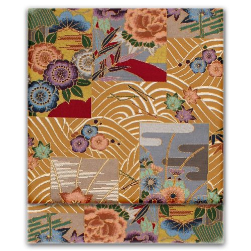軽くて締めやすく、丈夫で長く愛用して頂けると、きもの通のお客様からも定評があります。 大胆で鮮やかな色使いですが、俗名「彩美色紙文」の名前通り、色紙の中に四季折々の草花の柄を配置した、流行に左右されない古典柄です。その独特の色使いが帯の柄を立体的な表情に表現してくれました。