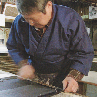 小紋や更紗などの型染めに使用する型紙は美濃和紙に柄を彫刻したものです。型紙は何度も繰り返し糊をのせて捺染加工と水洗いをするため、水に強く、丈夫でなければなりません。そのため水に強い美濃の手漉き和紙を、柿渋で2,3枚張り合わせて強度と耐水性を増したものに、彫り師が彫刻を施し、型紙として使用してきました。この技術は江戸時代から継承され現在も変わっていません。富田染工芸には、創業当時から保存されている型紙が12万枚以上保存されており、現在もこれらの型紙の一部を使用して染小紋を行っています。